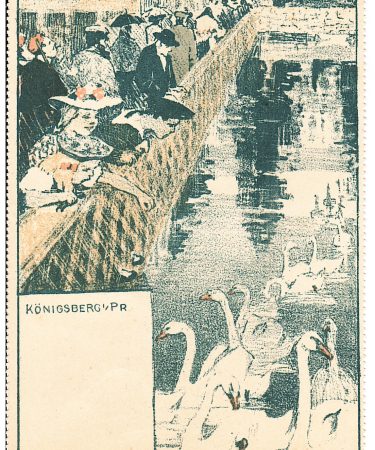 На открытке изображена элегантная сцена прогулки рядом с водоёмом в Кёнигсберге. Люди в нарядной одежде стоят, наблюдают и кормят птиц. В воде плавает группа белых лебедей, отражающихся на спокойной поверхности пруда. Откыртка выполнена в технике литографии с ограниченной цветовой гаммой: преобладают бежевые, коричневые и серо-зелёные тона. Это ещё одна открытка из календаря Гёте-Бунда 1905 года …