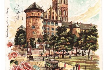 На открытке запечатлены три памятники, которые находились в Кёнигсберге. Памятники Вильгельму I, Фридриху Вильгельму III и первому герцогу Прусси Альбрехту. Все памятники были утрачены после Второй Мировой войны.