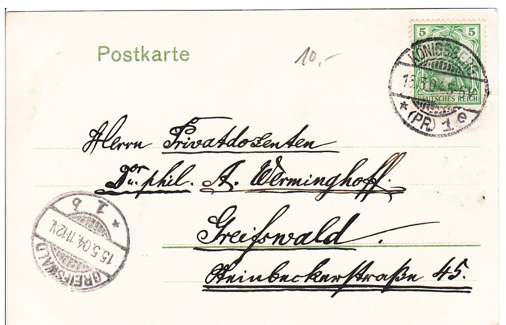 На открытке, отправленной в 1904 году, видна Palastra Albertina в Кёнигсберге (ныне Калининград). Она была частью знаменитого Университета Альбертина — одного из старейших университетов Восточной Европы, основанного в 1544 году герцогом Альбрехтом Прусским.