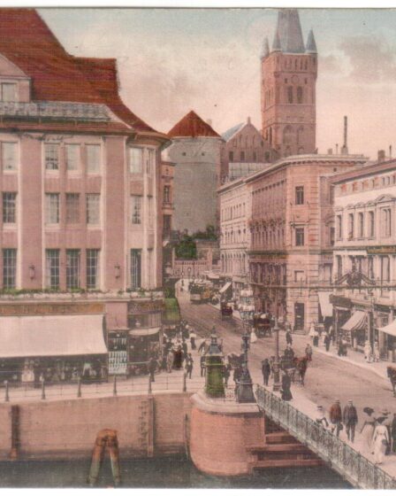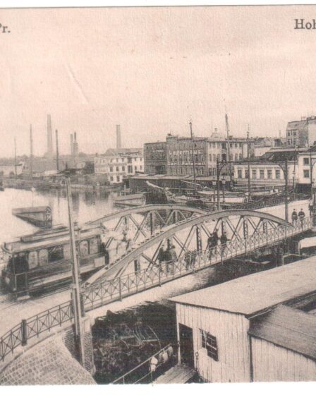 На открытке, отправленной в 1914 году, виден Высокий мост (Hohe Brücke/Хох-брюке). Первый Высокий мост был построен в 1520 году. Он соединял Ломзе и Форштадт. В 1882 году мост был перестроен, при этом был возведён так называемый домик смотрителя моста. На открытке справа виден фрагмент этого здания. В домике находились механизмы управления старым (разводным) Высоким мостом. …