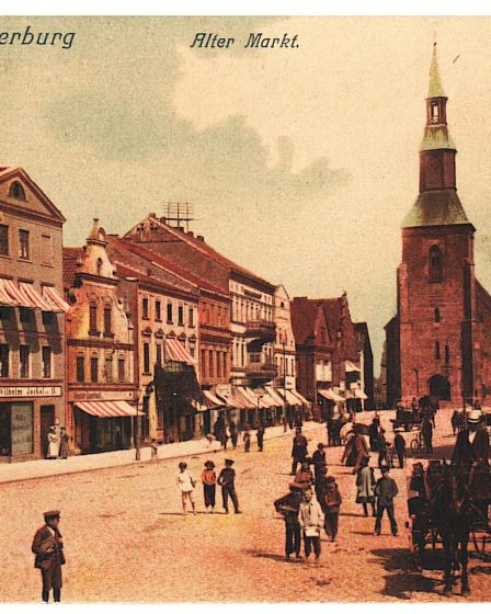 На открытке, оправленной в 1914 году, виден Старый рынок Инстербурга (Alter Markt), который был центральной рыночной площадью города, ныне известного как Черняховск. После Первой мировой войны он оставался важным общественным пространством, где проходила торговля и городские мероприятия. В то время на площади не было сложной сети троллейбусных линий, а транспорт состоял преимущественно из конных экипажей …